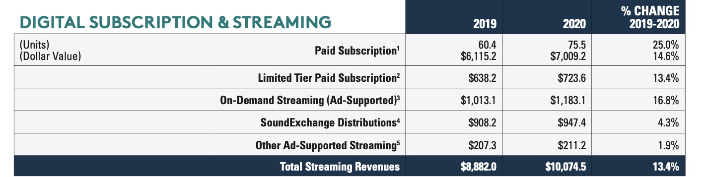 Streaming formats (including ad-supported and paid, on-demand and non-interactive) generated $10.075bn in the US in 2020, says the RIAA.