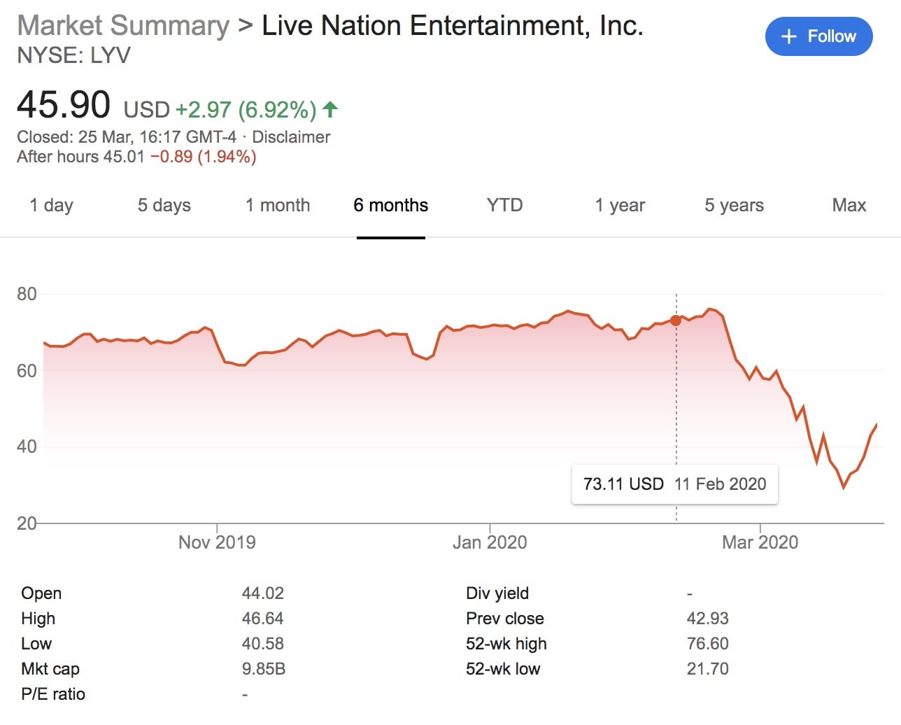 By way of example: the share price of Live Nation, whose market cap is springing back this week after a recent pummelling, is down 37% from close on February 11 to now.