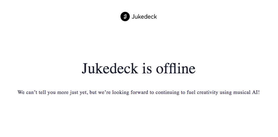 Jukedeck’s own website is now offline, aside from a homepage (pictured) displaying a message that reads: “We can’t tell you more just yet, but we’re looking forward to continuing to fuel creativity using musical AI!”Music Business Worldwide