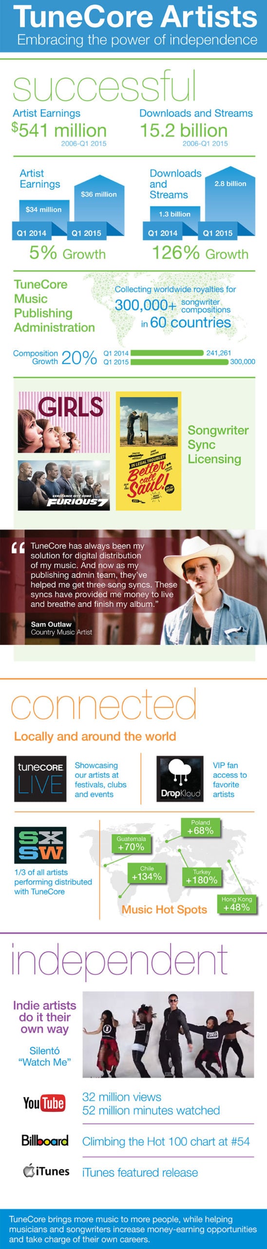 “It is amazing to explore all the different ways independent artists can connect with fans, reach new audiences worldwide and maximize their earnings. It’s such a exciting time in the music industry and for TuneCore, building off of the strong start of the year, we are looking forward to even greater things to come in 2015.”
