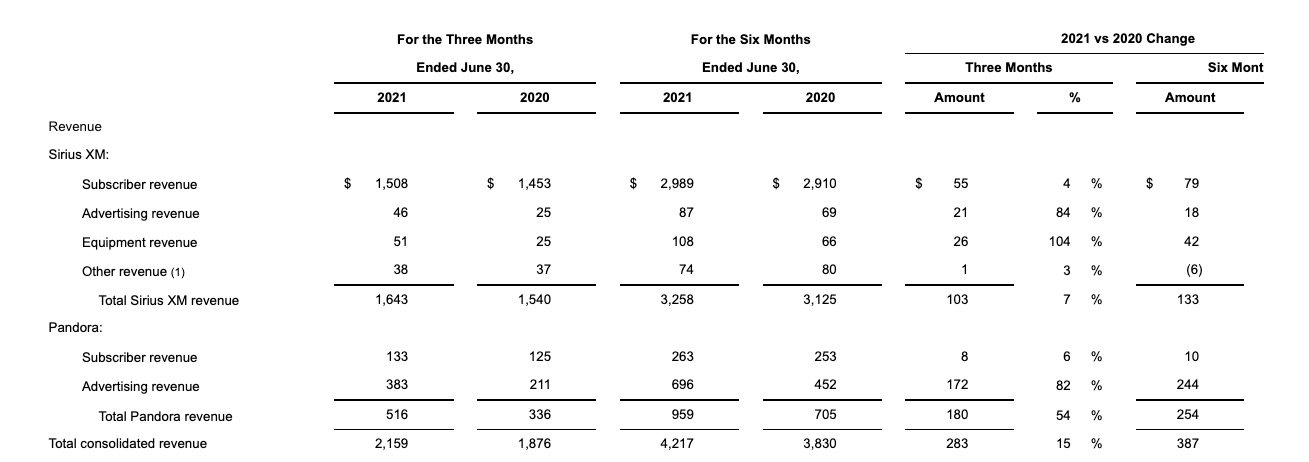 The SiriusXM platform itself generated $1.64 billion in Q2 2021, up on $1.54 billion in the equivalent period of last year.