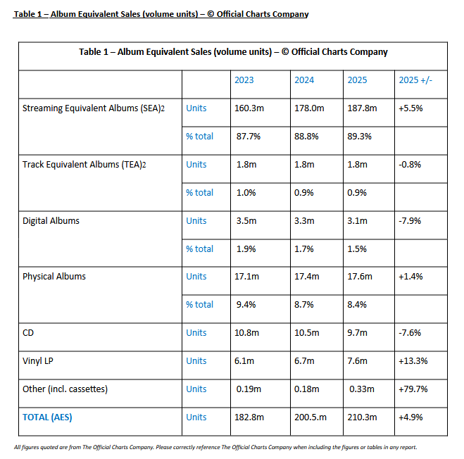 BPI’s data measured the 52 weeks ending on December 25, 2025. The trade group is planning to release recorded music sales numbers for 2025 in Q1 or Q2 of this year.