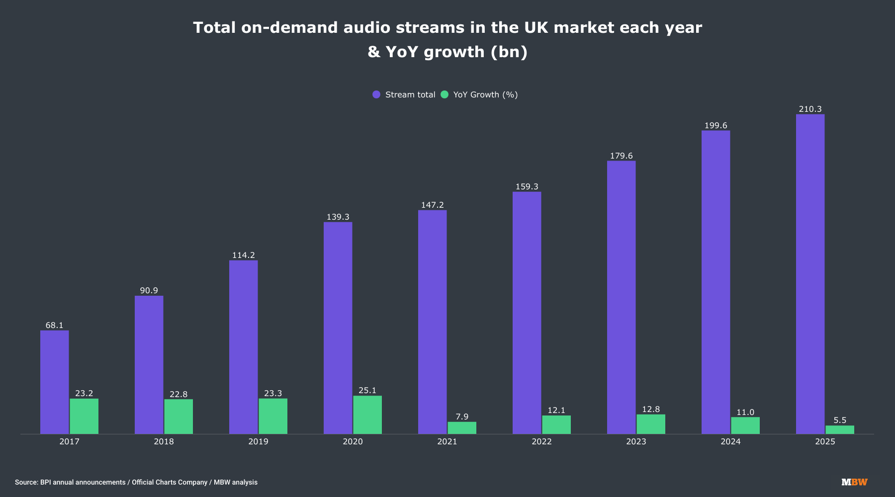 The BPI’s report on UK music consumption shows music streaming crossed the 200 billion-stream mark for the first time in 2025, growing 5.5% year-over-year to 210.3 billion streams.