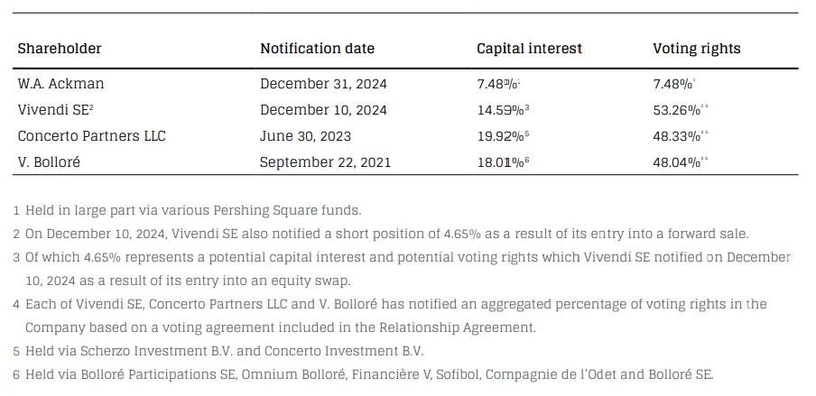 Vivendi, in turn, had a capital interest of 14.59% in UMG as of December 2024, though a portion of that was subject to a forward sale and equity swap, reducing Vivendi’s net economic exposure to approximately 10%.