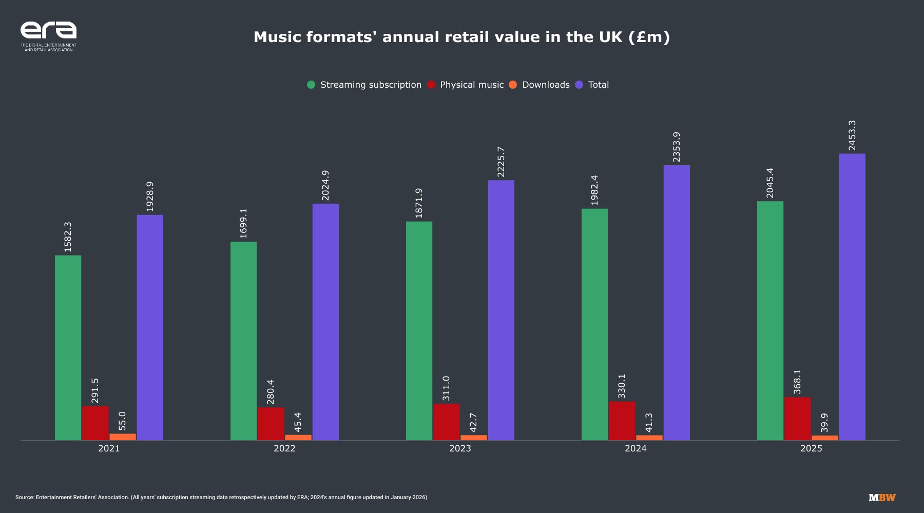 According to ERA’s data, some GBP £2.045 billion (USD $2.69bn) was spent on music streaming subscriptions in 2025, up from GBP £1.982 billion in 2024.
