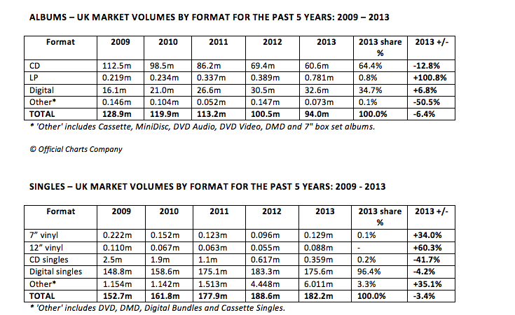 Sales of CD albums were down sharply by 12.8%, but it still claimed more than 60% of all albums sales. Vinyl album sales continued to shoot upwards, increasing 101% on 2012.
