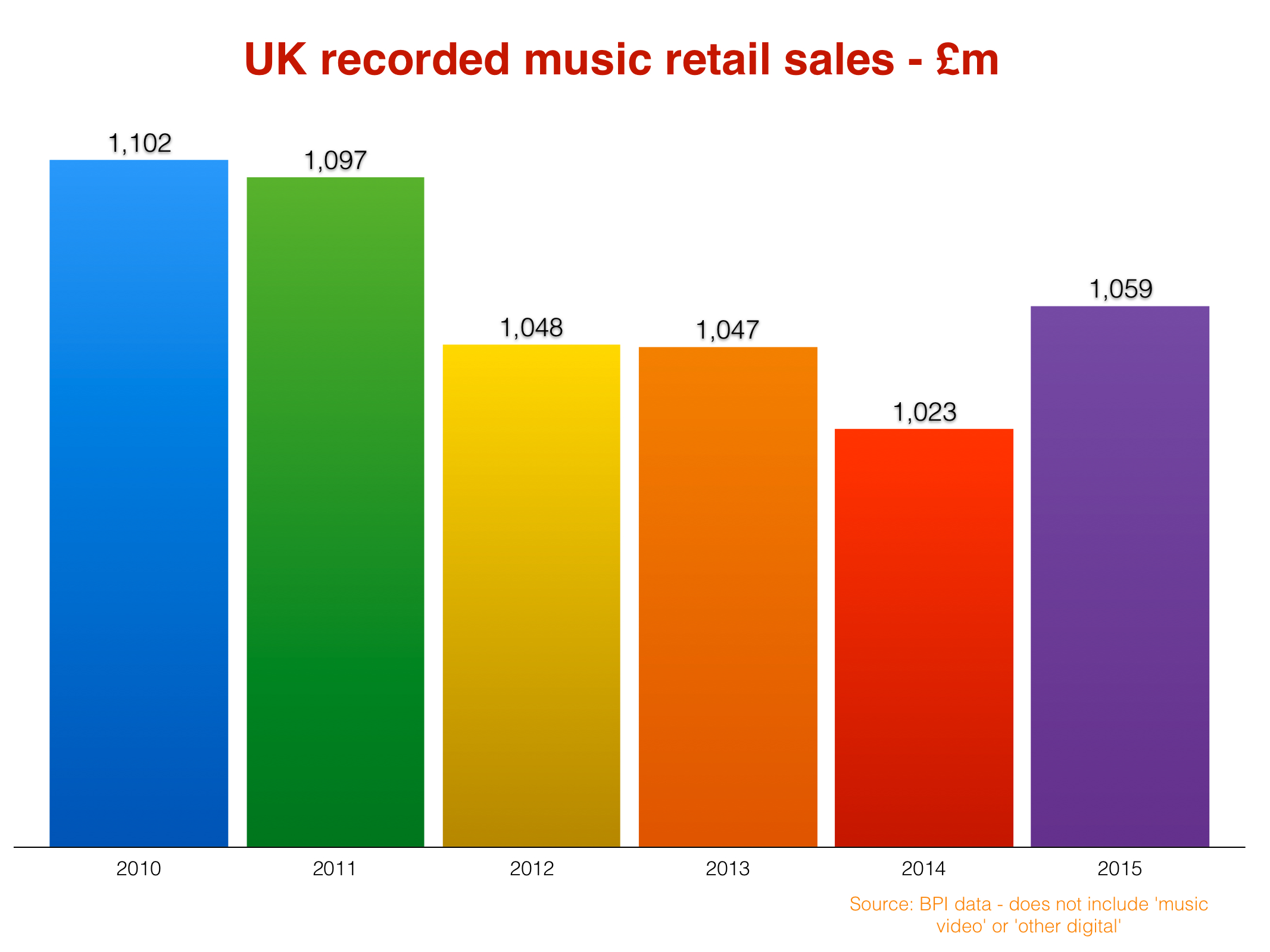 However, the BPI has decided not to reveal financial figures from ad-funded services within these stats – a category which typically contributes less than £10m each year – and has also omitted income from music video sales, which generated £18m in 2014.