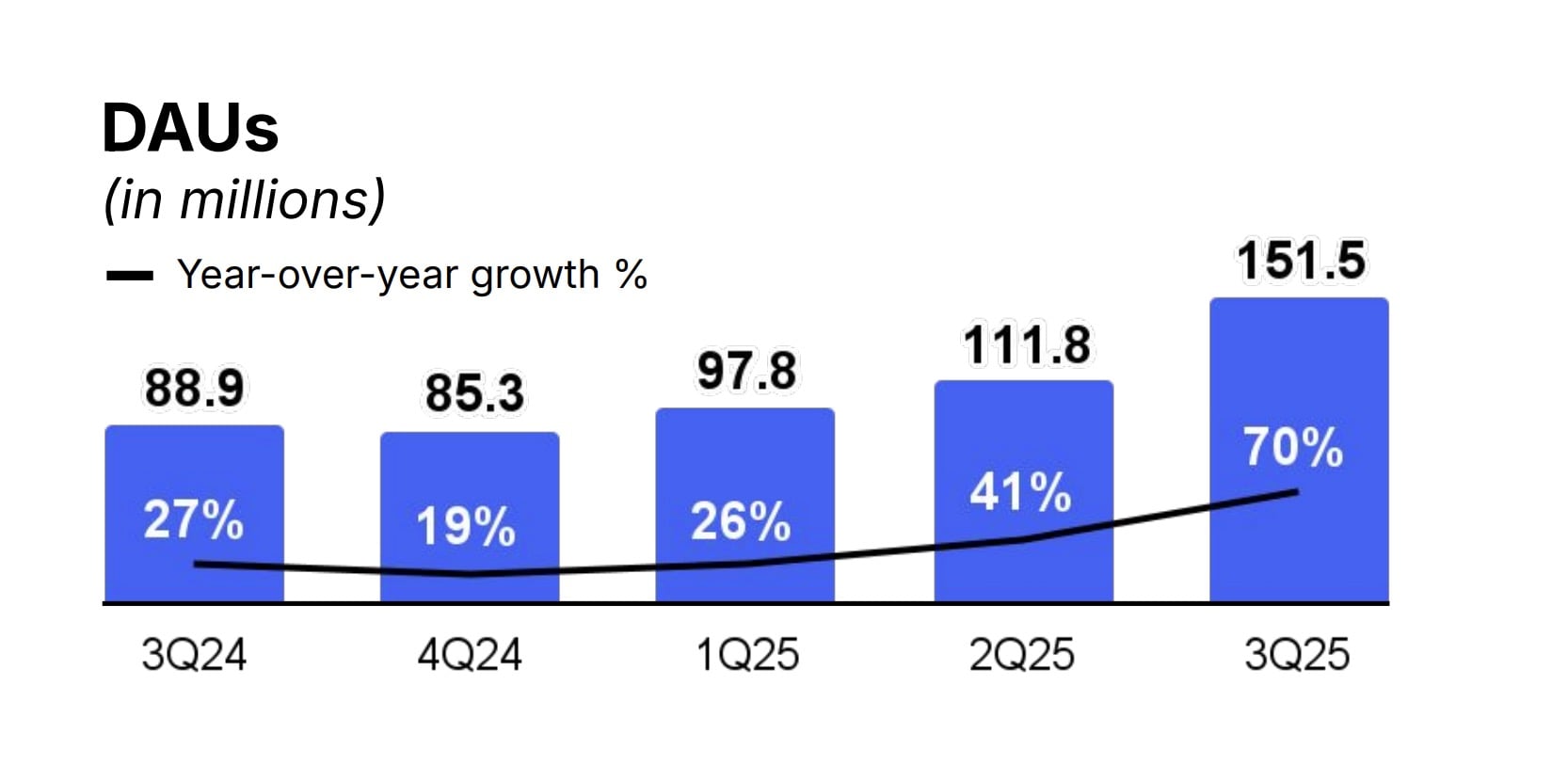Roblox told its shareholders in October that it exceeded 150 million Daily Active Users in Q3, up 70% YoY (see below).