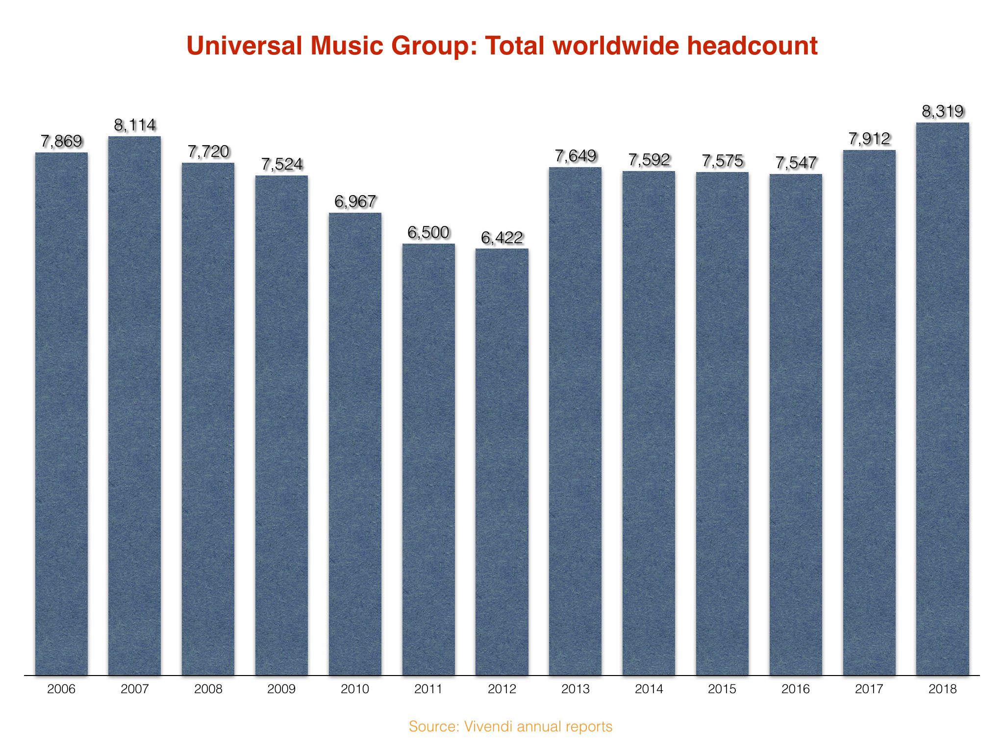 2012 is significant year to compare with, because it’s when UMG’s annual employment count hit a historic low (6,422) – presumably driven by a cautious emergence from the industry’s piracy-hit years.