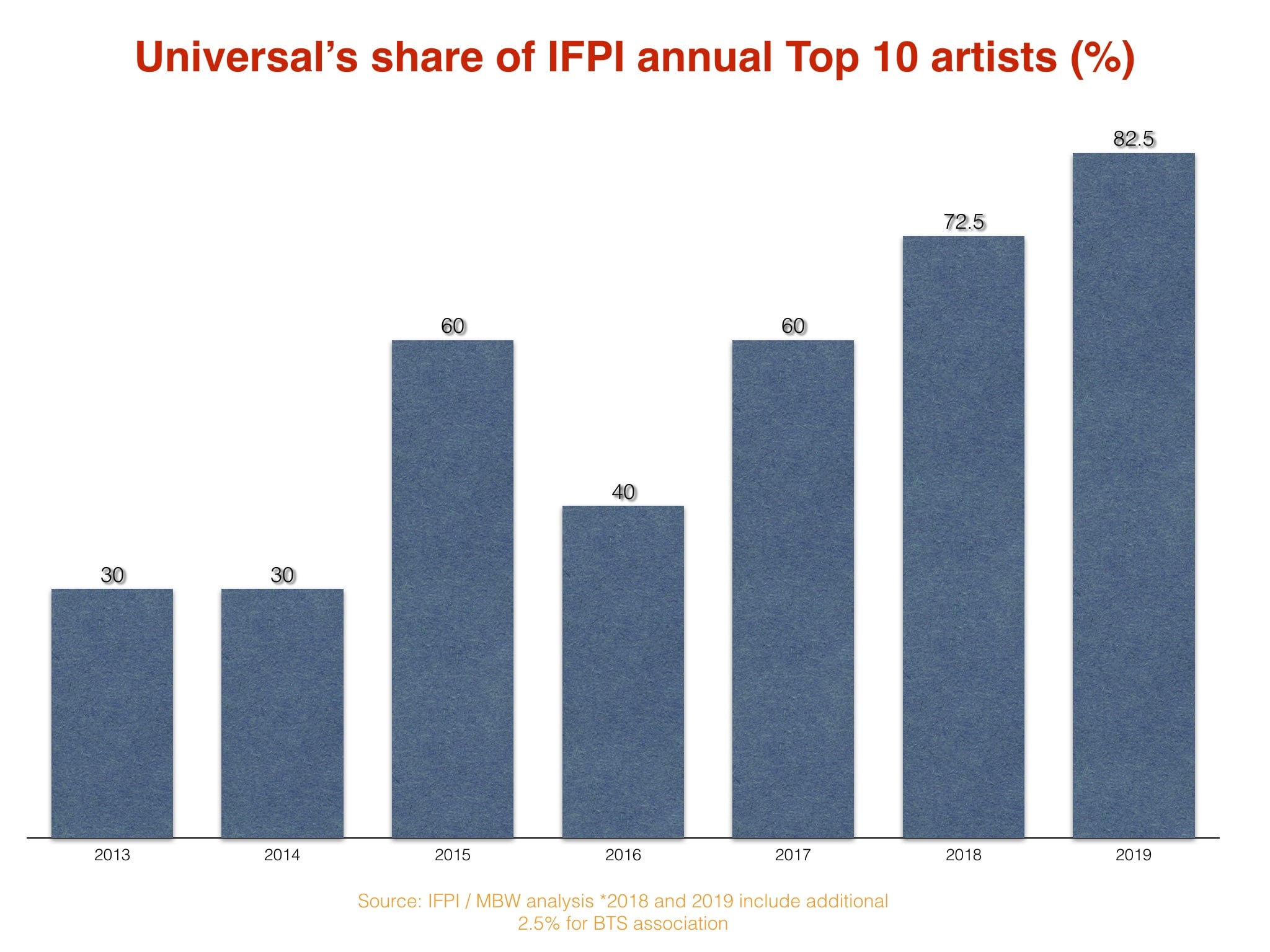 As you can see, Universal has steadily grown its percentage share of the Top 10 in recent years, with over 70% of the share in 2018 (Drake; Post Malone; Eminem; Queen; Imagine Dragons; Ariana Grande; Lady Gaga – plus its share of BTS).