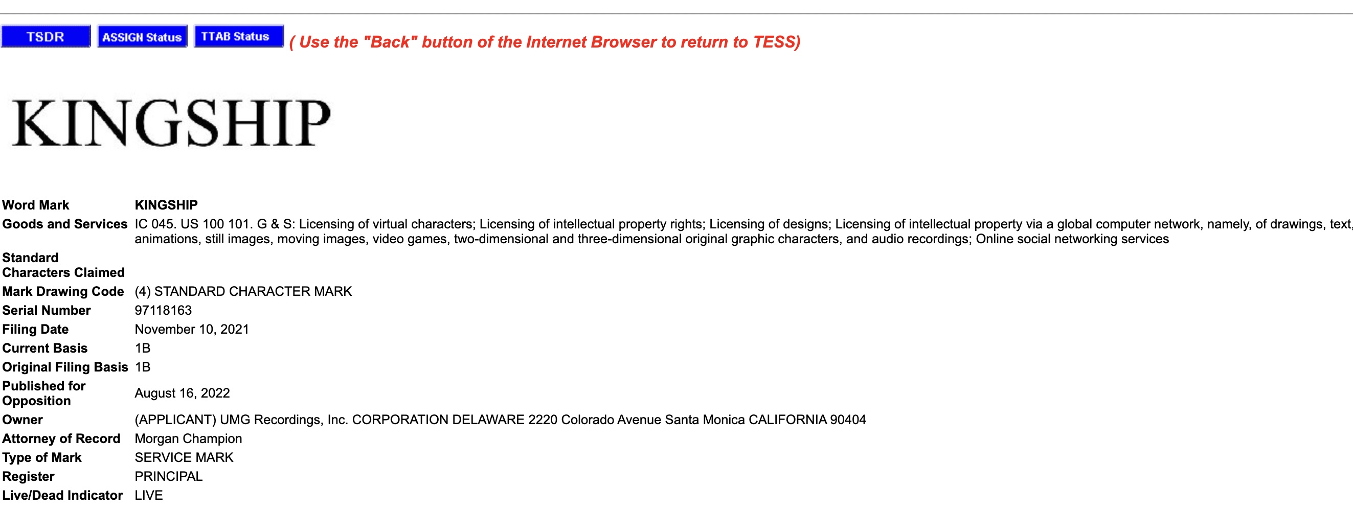 UMG has also filed for KINGSHIP trademarks in various other categories, with applicable goods and services ranging from digital and blockchain assets to photo, video, and data sharing services.