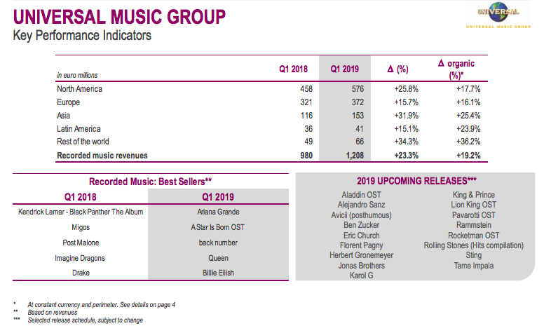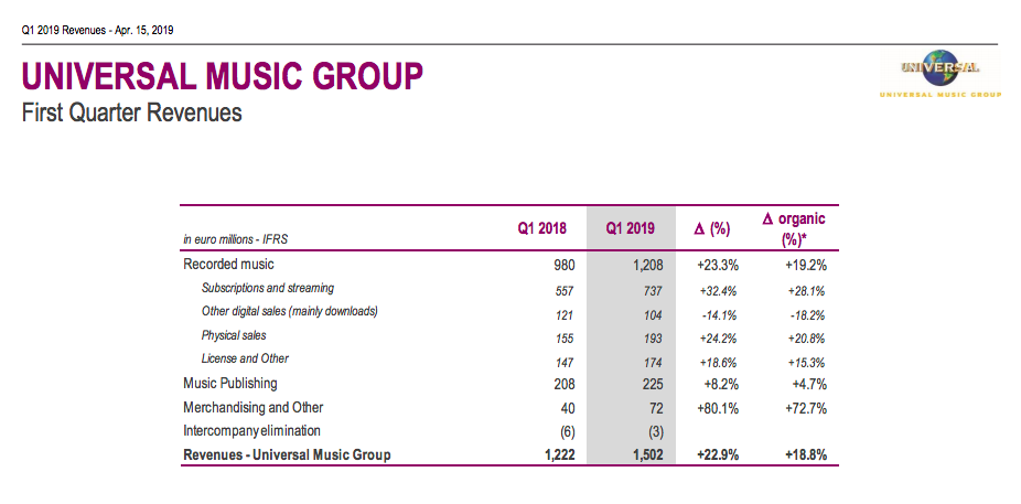 Universal Music Group‘s recorded music operation turned over €1.208bn ($1.37bn) in the first three months of 2019 – up 19.2% year-on-year at constant currency.