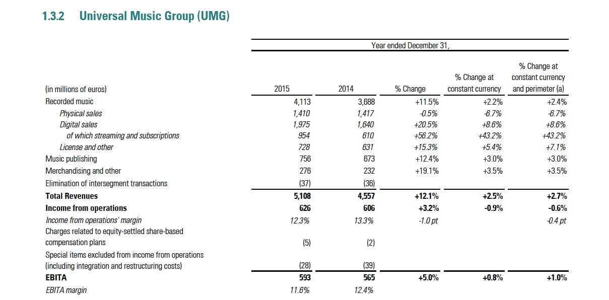 Helped by exchange rates, Universal Music Group‘s overall revenues in 2015 – including recorded music, publishing, merch and more – stood at a whopping €5.11bn ($5.56bn).