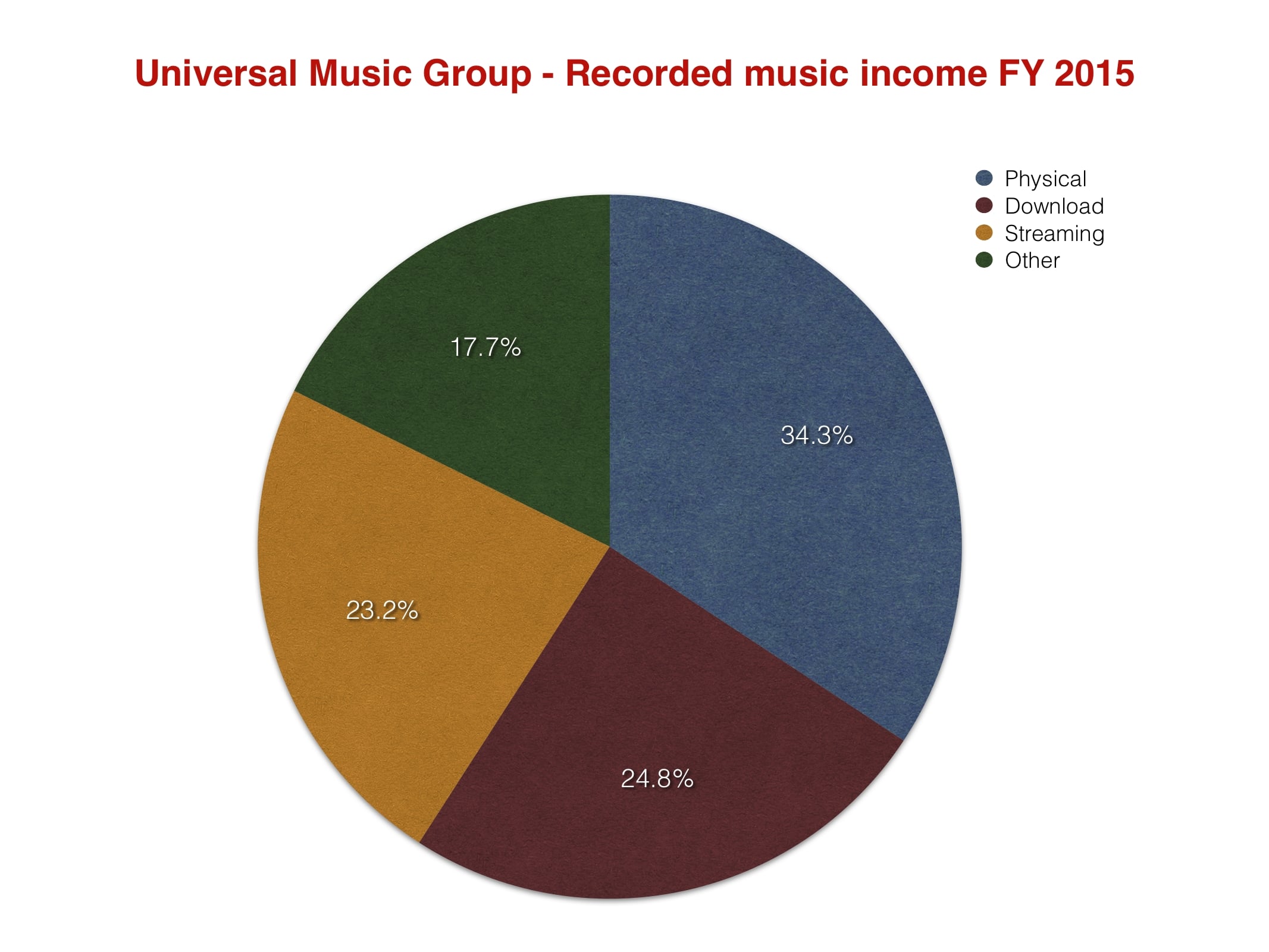 As such, CD and vinyl claimed 34.3% of UMG’s total recorded income pie in 2015, far less than digital’s 48%, with licensing (sync – ‘other’) growing 7.1% to €728m.