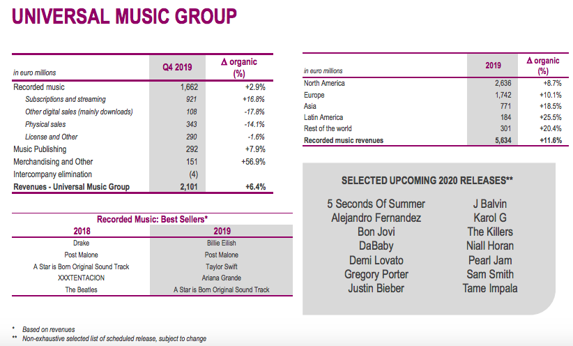 As the biggest recorded music company in the streaming age, the impressive amount of dollar pulled in by UMG often serves up some sizzling headlines. Today, for example, we could have gone with Universal is now generating over $11m every day from streaming. It would have been fun, and true (the firm generated €921m, or $1.02bn, in recorded music streaming revenues in Q4 2019, according to parent Vivendi’s new financials, published today.)