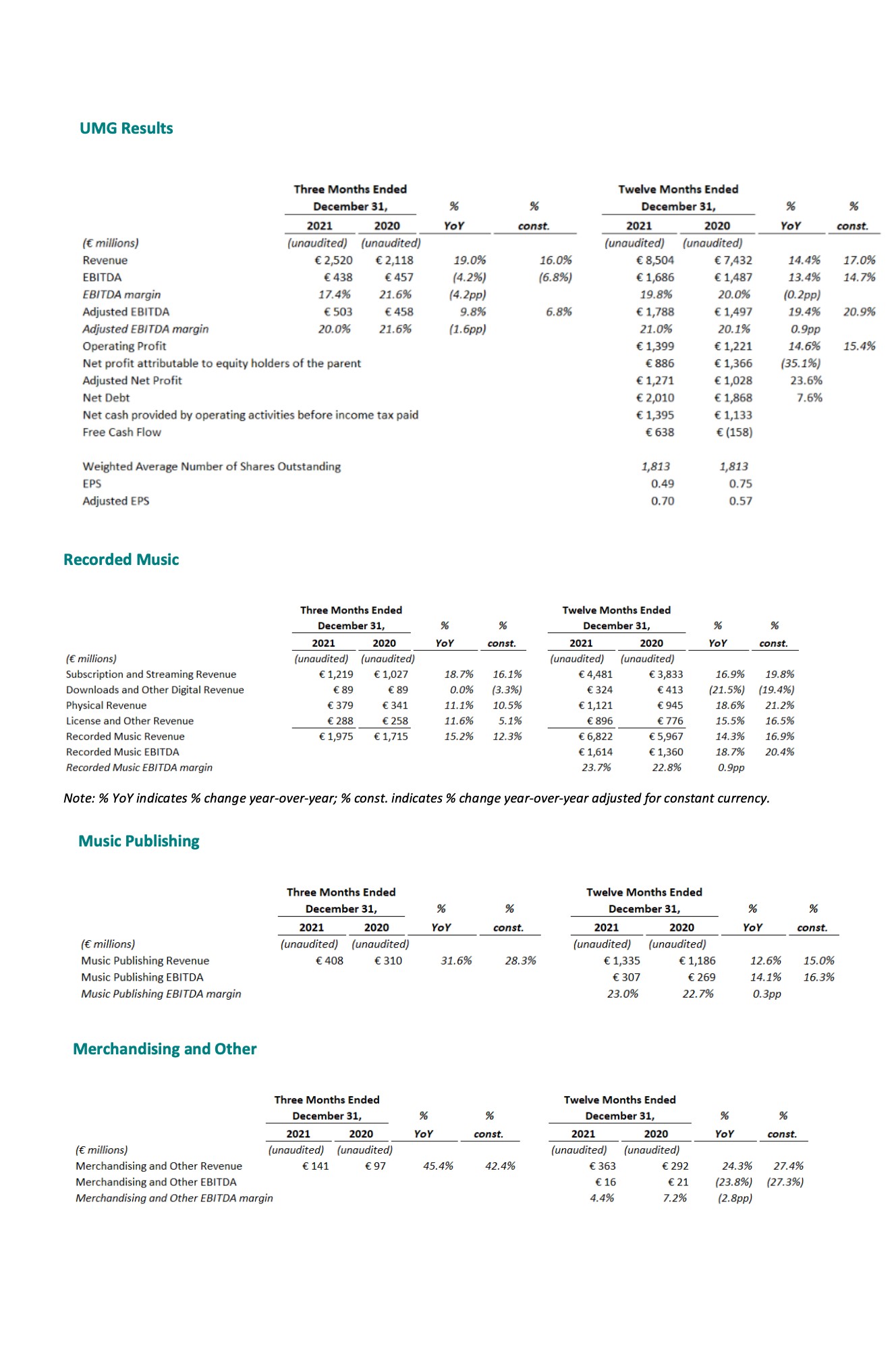 UMG’s annual recorded music revenues in 2021 hit €6.82 billion ($8.06bn), up 16.9% YoY at constant currency.