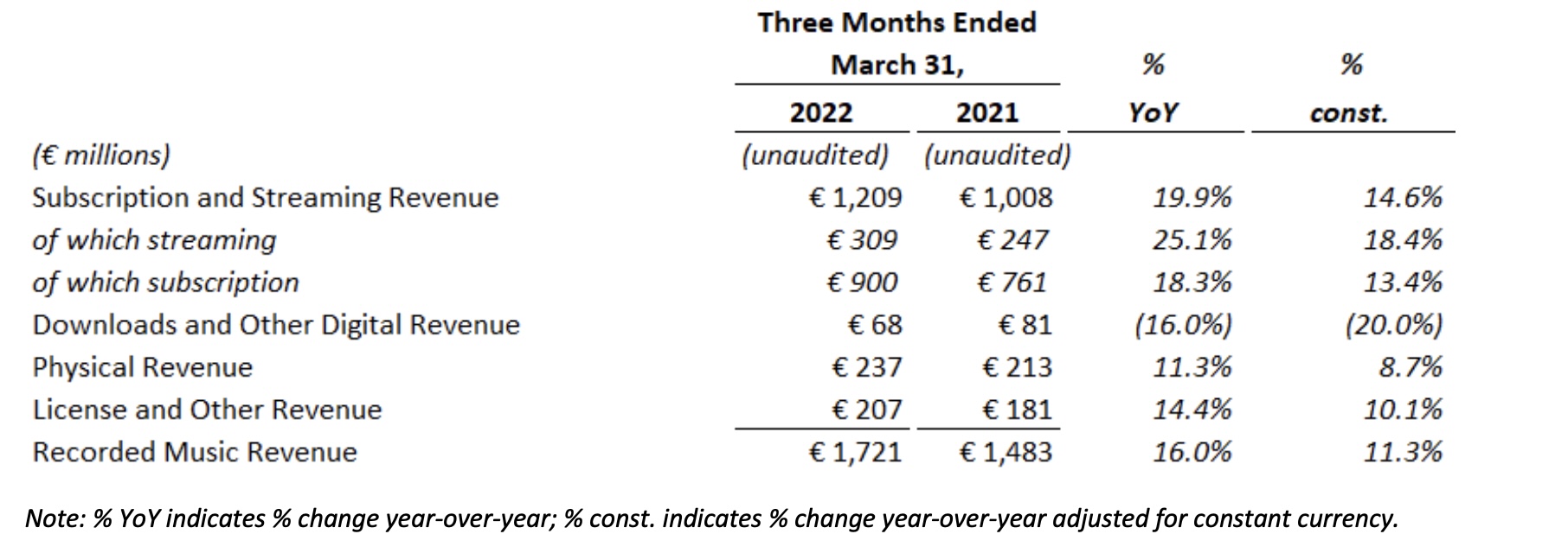 Overall recorded music revenues (including streaming plus physical etc.) for Q1 2022 were €1.721 billion ($1.93bn), up 11.3% at constant currency (see below).