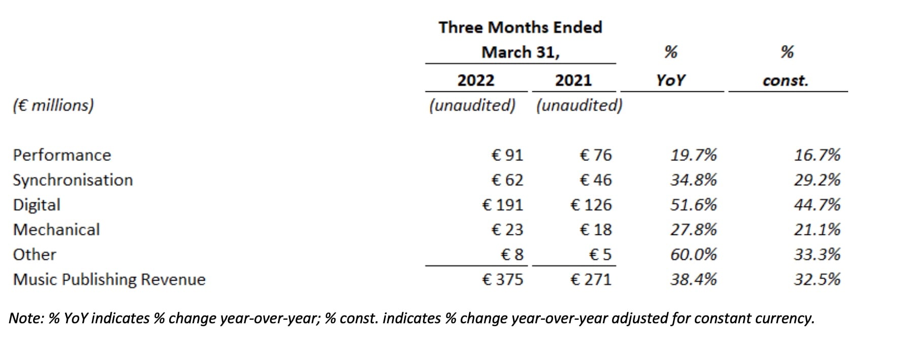 Universal’s Music Publishing division, Universal Music Publishing Group, generated revenues of €375 million ($420.63m) in Q1 2022, up 32.5% YoY at constant currency.