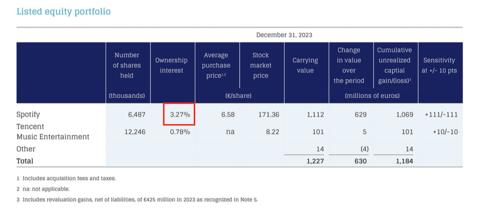 According to Universal Music Group’s 2023 annual report, its ownership stake in Spotify at the close of last year amounted to 3.27%.