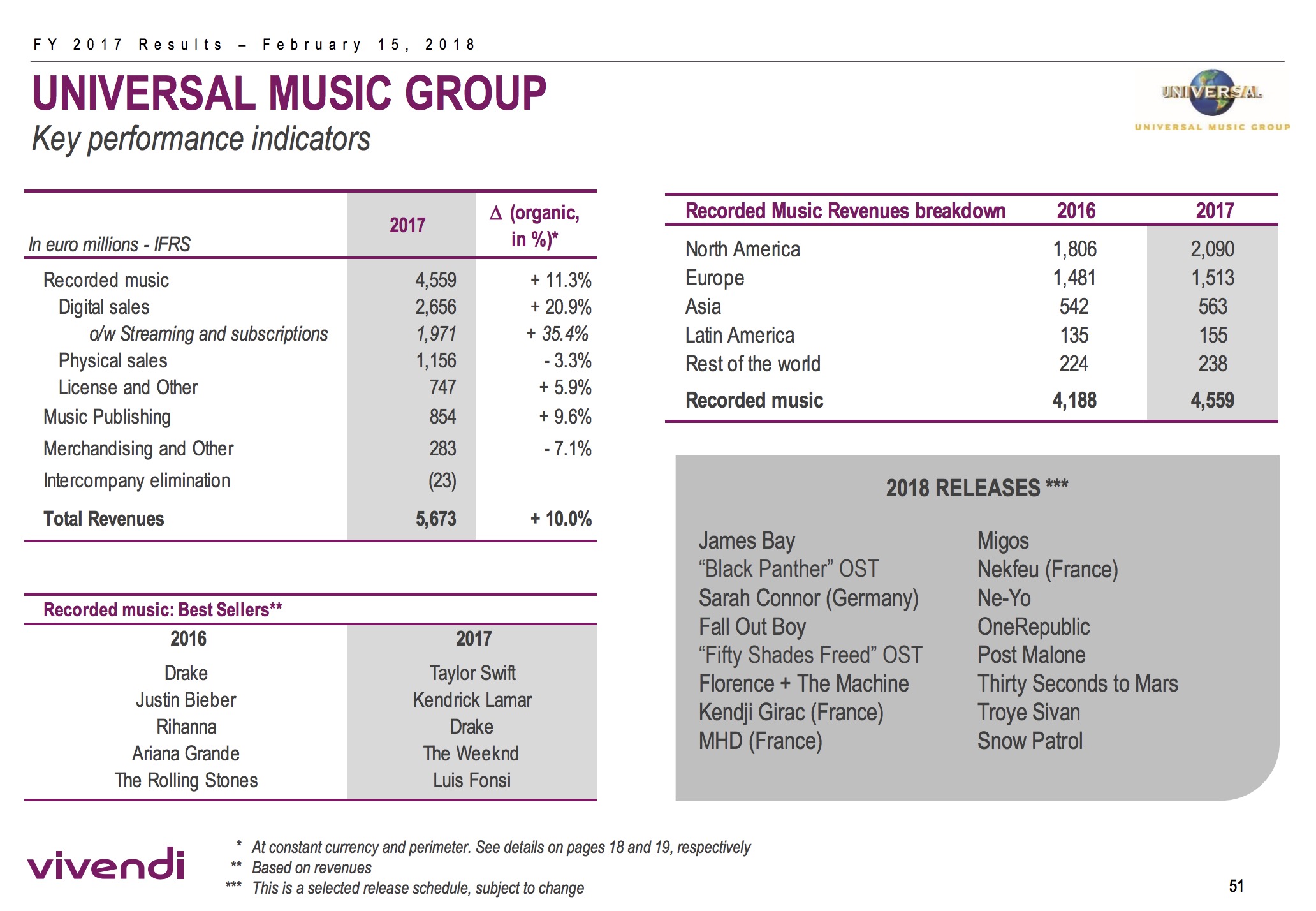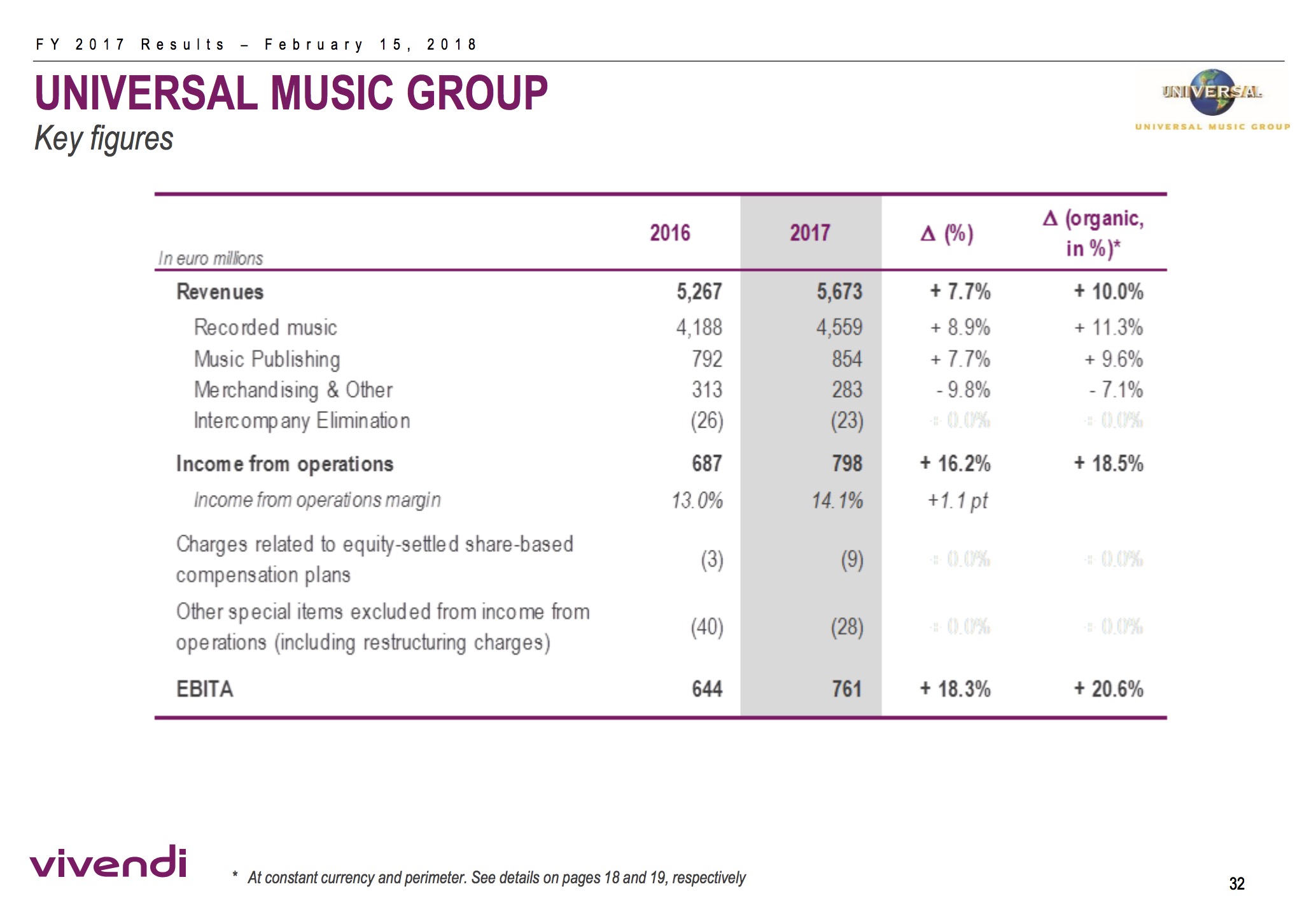 Euro to USD conversions made at average annual 2017 (Jan-Dec) exchange rate ($1.13 to €1). All % figures shown at constant currency/perimeter.Music Business Worldwide