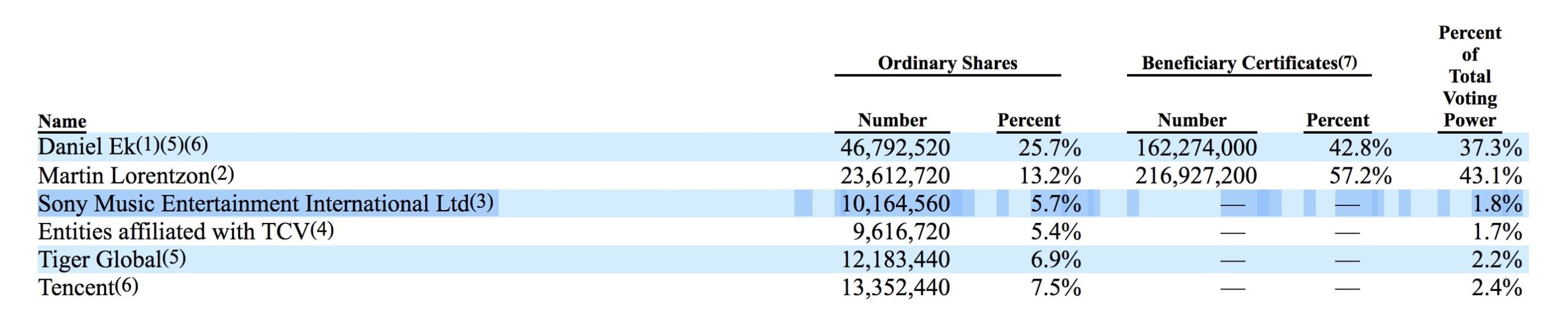 That filing revealed that only one major music group, Sony Music, currently owns a shareholding of more than 5% in Spotify.