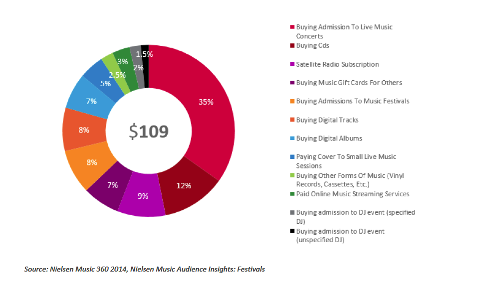According to Nielsen’s data, these consumers are spending $109 each per year on music – but the majority of their money is going on live events.