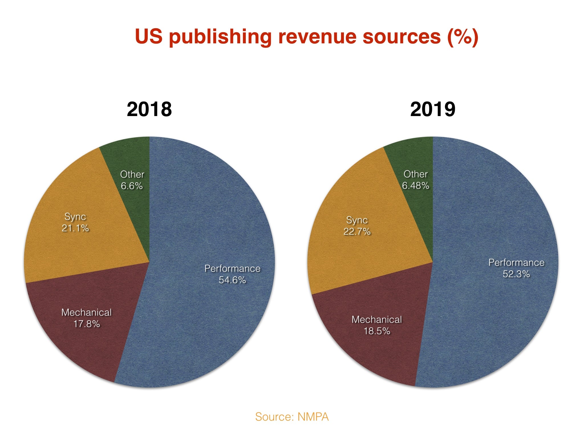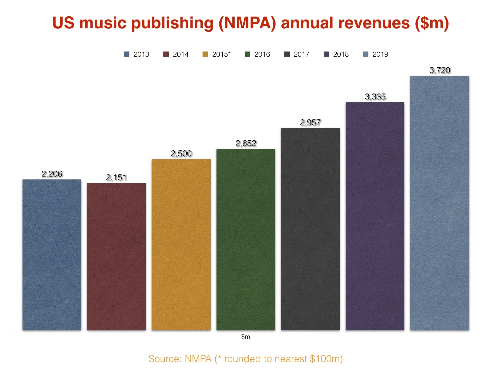 Another fun stat: 2019’s $3.72bn figure was up by more than $1.5bn – in annual revenue, remember – on the $2.15bn that the NMPA reported five years prior, for 2014.