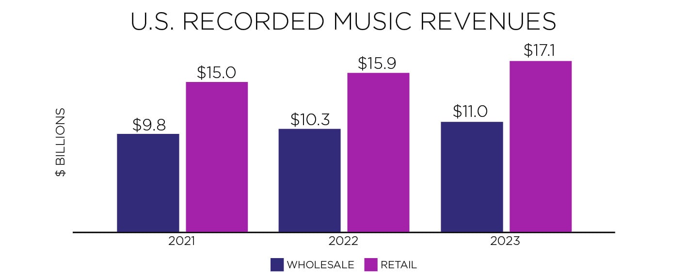On a wholesale basis – i.e. the money that makes its way back to record labels, distributors and ultimately artists – the US recorded music industry generated $11 billion in 2023 (see below).