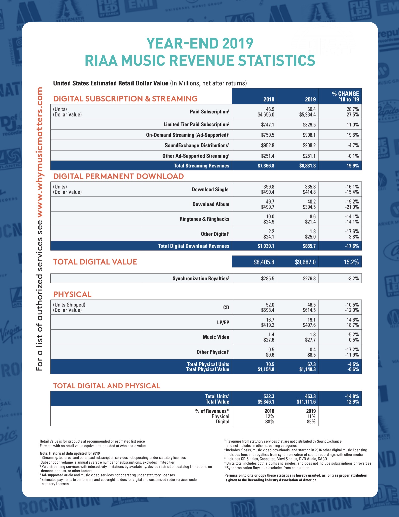Today (February 25) new figures published by US recorded music trade body the RIAA, show that on a retail basis – i.e. the money spent on streaming subscriptions, as well as physical and digital music – recorded music revenues in the US grew 13% in 2019 to hit $11.1bn.