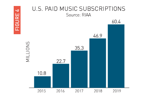 Total 2019 subscription revenues of $6.8bn were up 25% compared to 2018, and accounted for 61% of total recorded music revenues in the US.