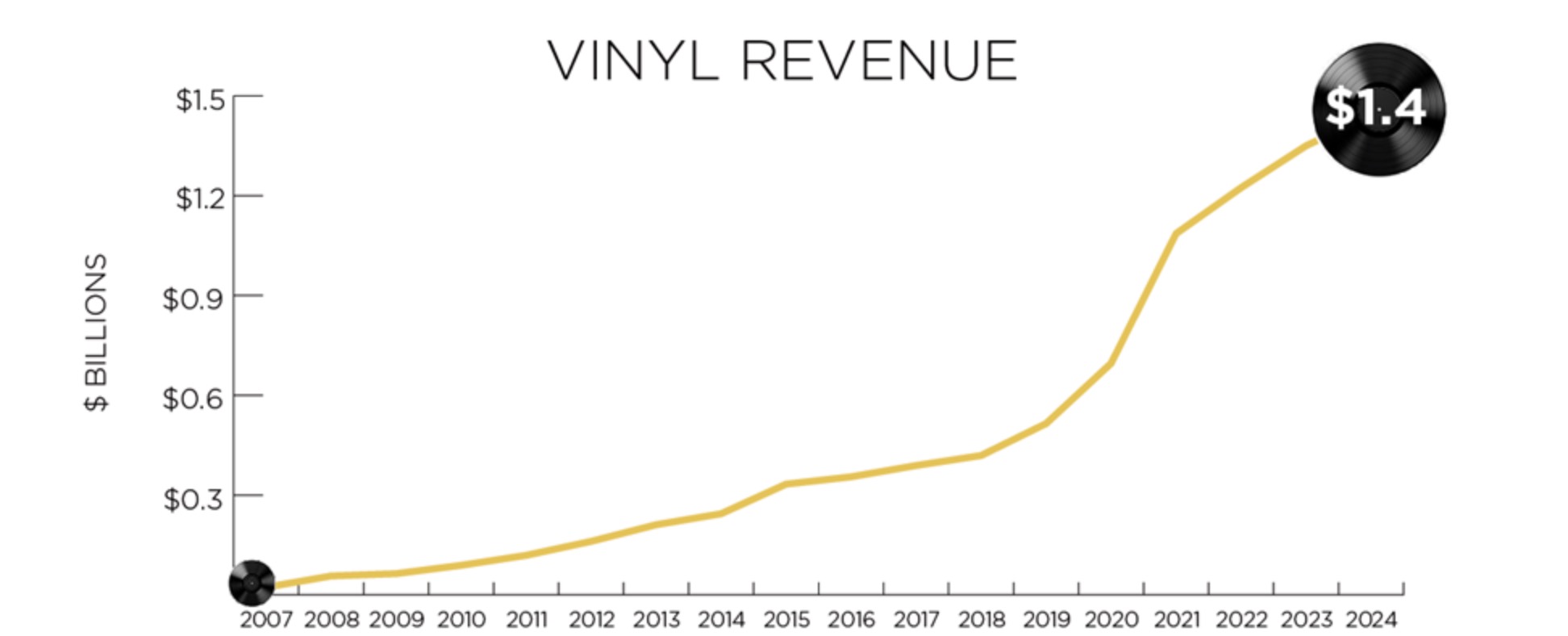According to the RIAA‘s 2024 year-end report, sales of vinyl records grew for an 18th consecutive year in the US in 2024, generating $1.4 billion, which was up 7% YoY and marked the highest vinyl sales tally since 1984.
