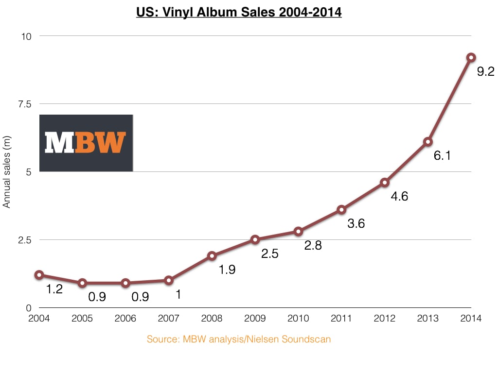 To put the achievement into context, the biggest annual US vinyl sales performance in the 10 years after Nielsen started monitoring the market (1993-2003) stood at 1.5m in the year 2000 – six times smaller than 2014’s tally.