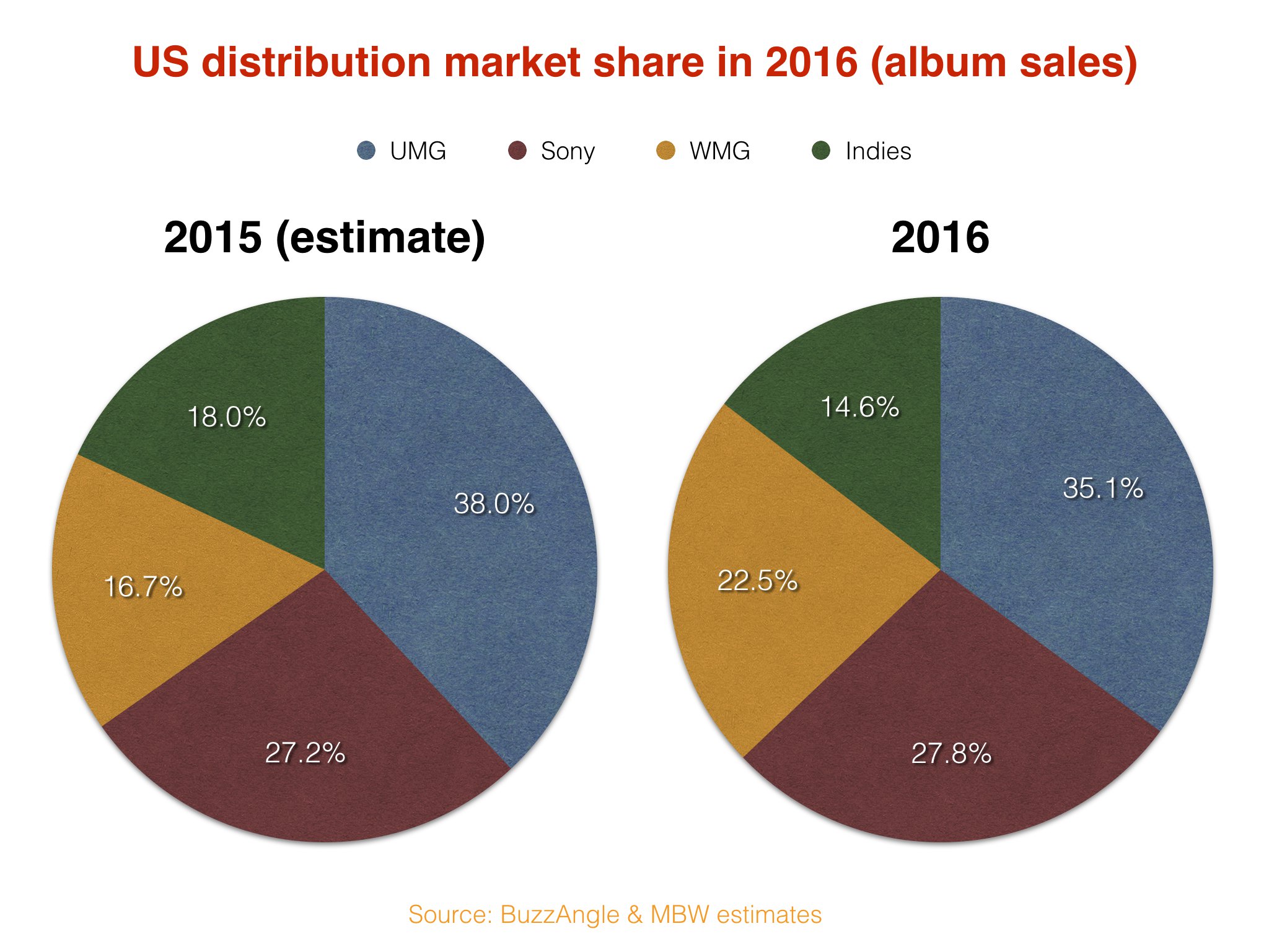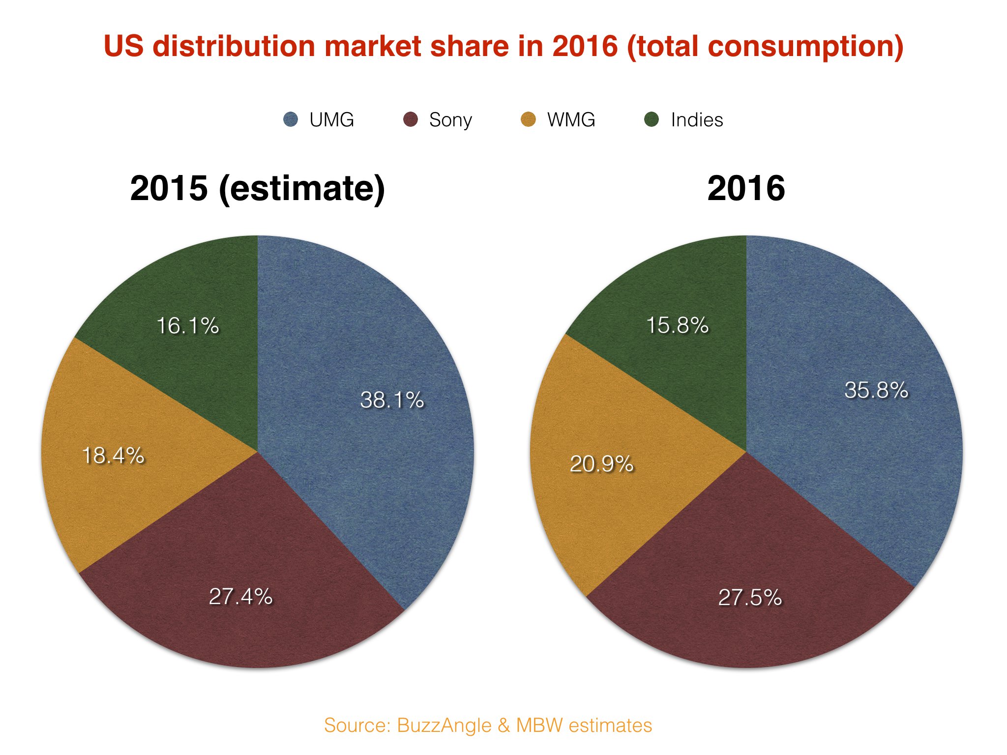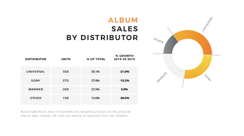 That’s according to new data from trustworthy market monitor BuzzAngle, which shows that UMG’s US distribution market share by volume (covering streams, track downloads and album sales) in 2016 stood at 35.8%.