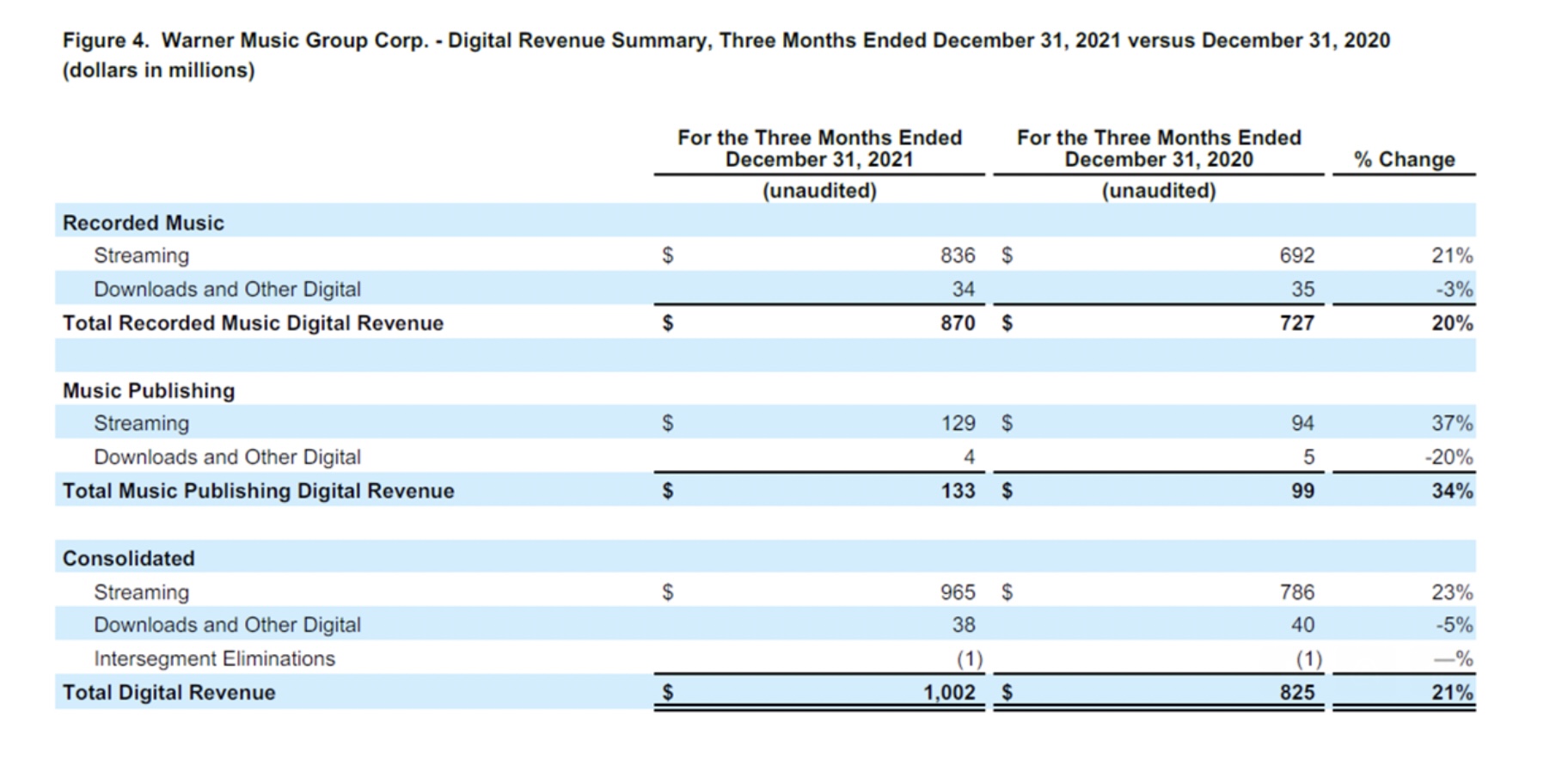 With Warner Music Group breaking out streaming revenues from publishing and recorded music in its Calendar Q4 earnings report (see Figure 4 below), the company reveals that its consolidated revenues generated from streaming (recorded music business and publishing operation combined) hit $965 million in calendar Q4 2021, up 23% YoY from $786 million in calendar Q4 2020.