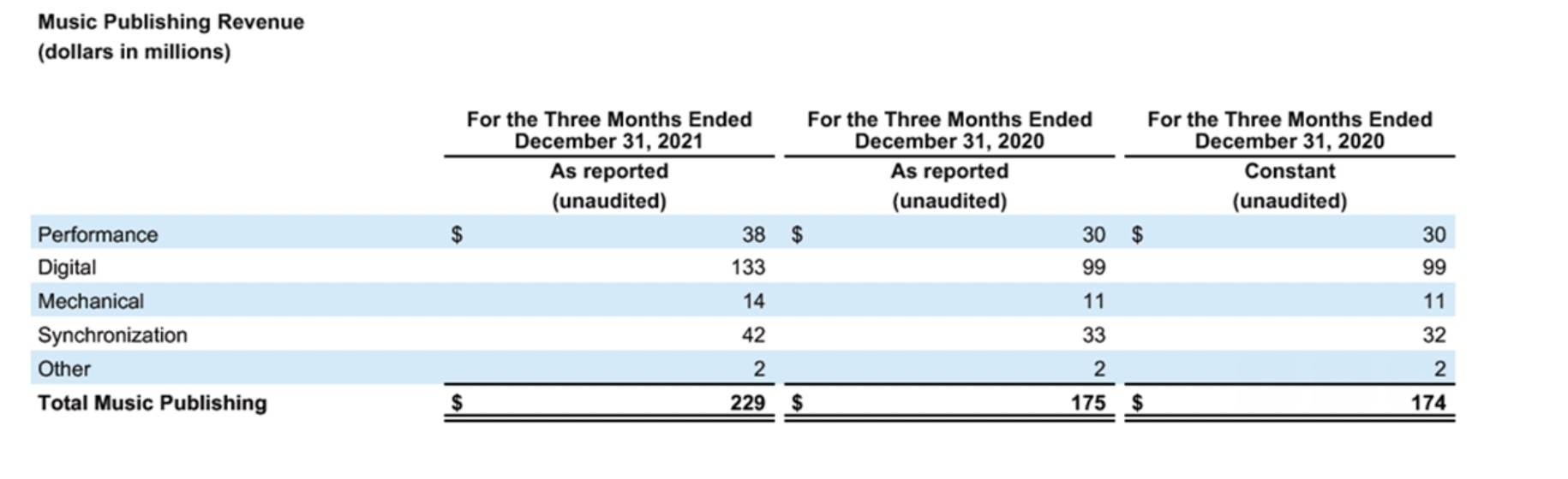 Digital revenue (including streaming and downloads), grew 19.7% (or 20.5% in constant currency), from $727 million in the prior year quarter, to $870 million in the three months to end of December 2021.
