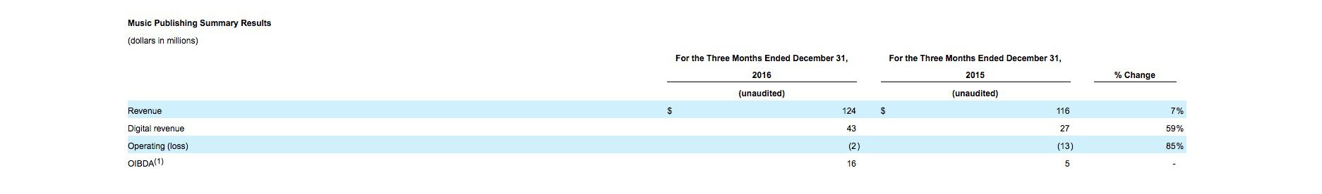 Warner’s total recorded music revenue increased by $60 million to $797 million for the three months ended December 31, 2016.