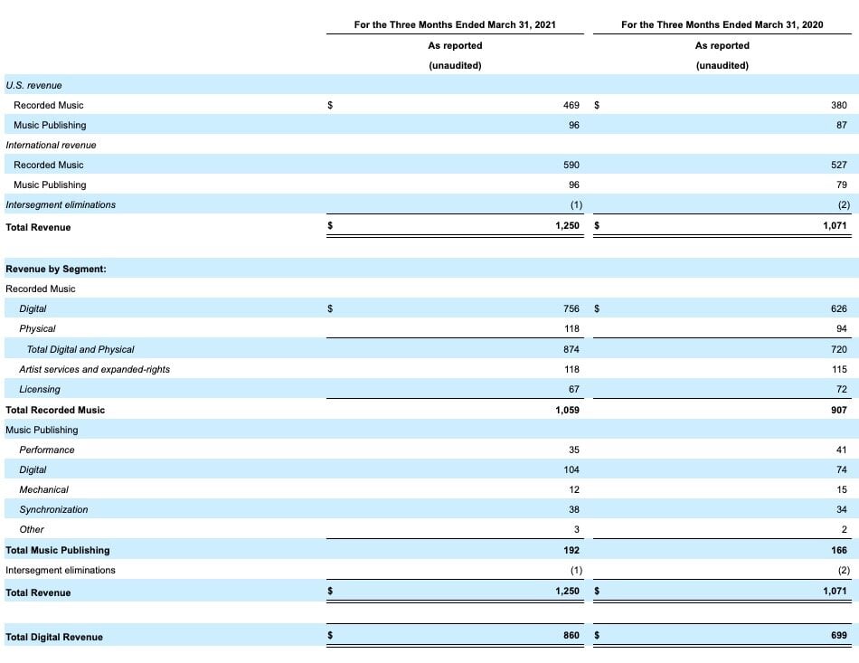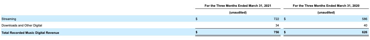 Within this recorded music figure was $722 million from streaming, a number which was up by 23.2% YoY (or 20.3% at constant currency) in comparison to calendar Q1 2020.