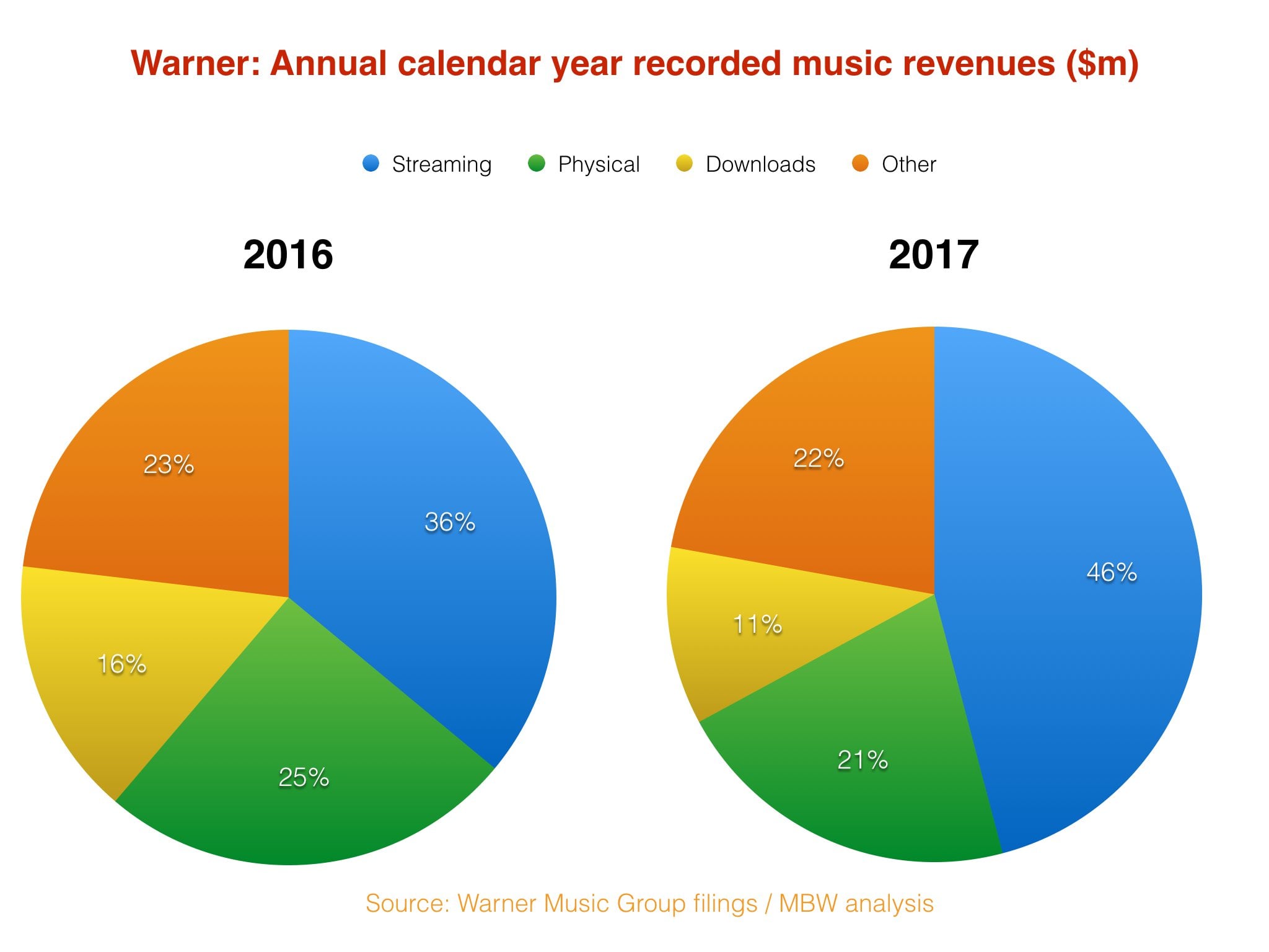 Streaming made up 46% of Warner’s total recorded music revenues in calendar 2017 – and that’s including ‘Artist Services’ and Licensing revenue (represented by ‘Other’ below).
