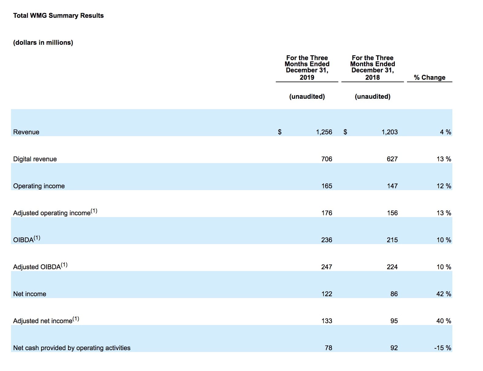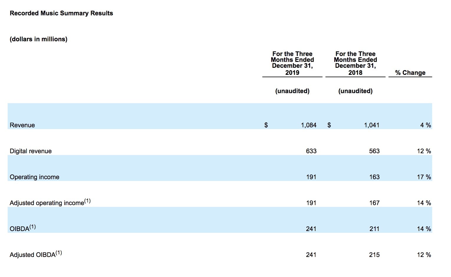 WMG’s recorded music revenues in the quarter (fiscal Q1 / calendar Q4) hit $1.08bn, up 4.1% year-on-year (or 5.1% at constant currency).