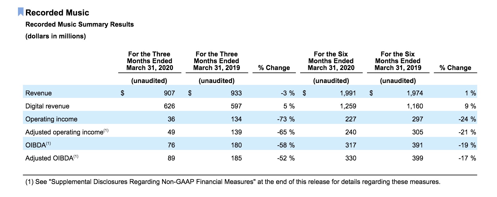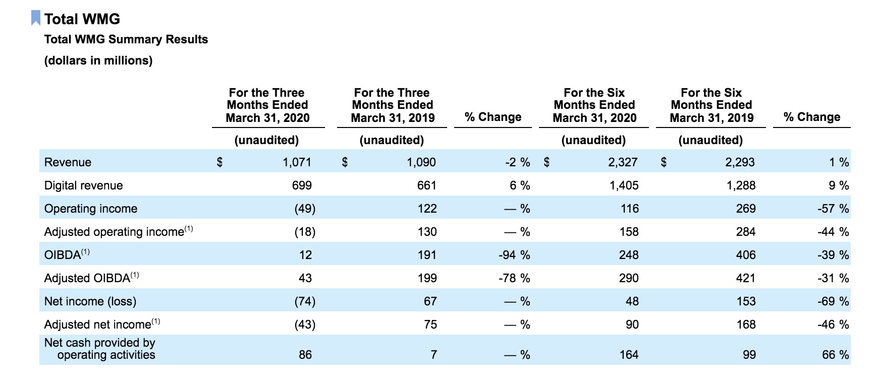 WMG posted a company-wide operating loss in calendar Q1 (fiscal Q2) of $49m, compared to an operating income of $122m in calendar Q1 2019.