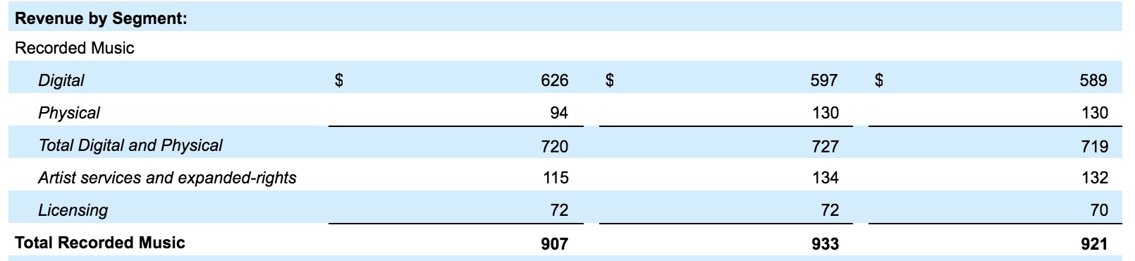 The biggest impact on WMG’s quarter came in terms of physical music sales, which fell by 27.7% – or by $36m – to $94m.