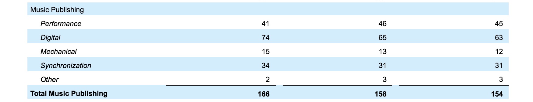 Warner/Chappell’s performance income fell by $5m YoY, but this was offset by gains in digital, mechanical and sync revenues.