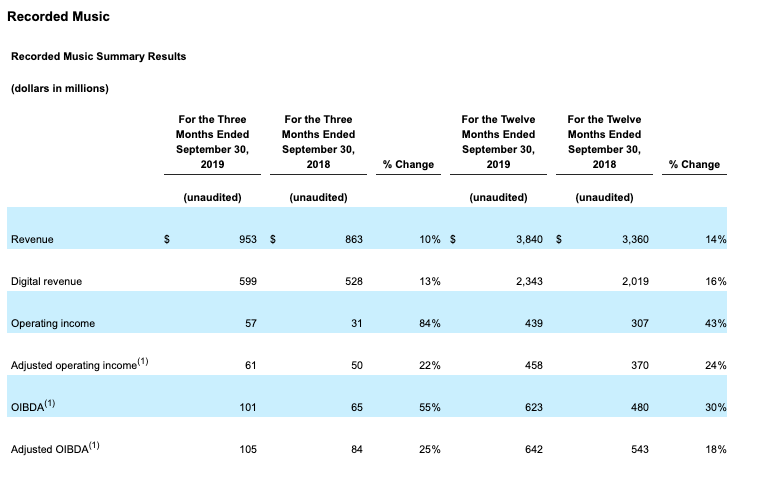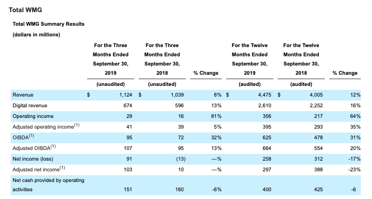 WMG-wide operating income for FY 2019 was $356m, up from $217m in the prior year and operating margin was 8% up from 5.4% in the prior year, driven by higher revenue, lower variable compensation expense and a $15m benefit from ASC 606 which were partially offset by higher product costs related to revenue mix.