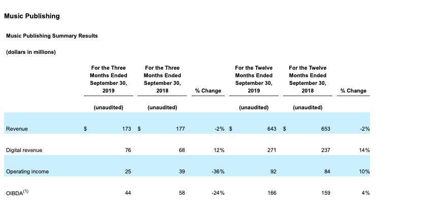 WMG’s total music publishing (i.e. Warner Chappell Music) revenue was $643m, down $10m on the prior year, while music publishing digital revenue increased 14.3% (or 17.3% in constant currency) from $237m in FY 2018 to $271m.