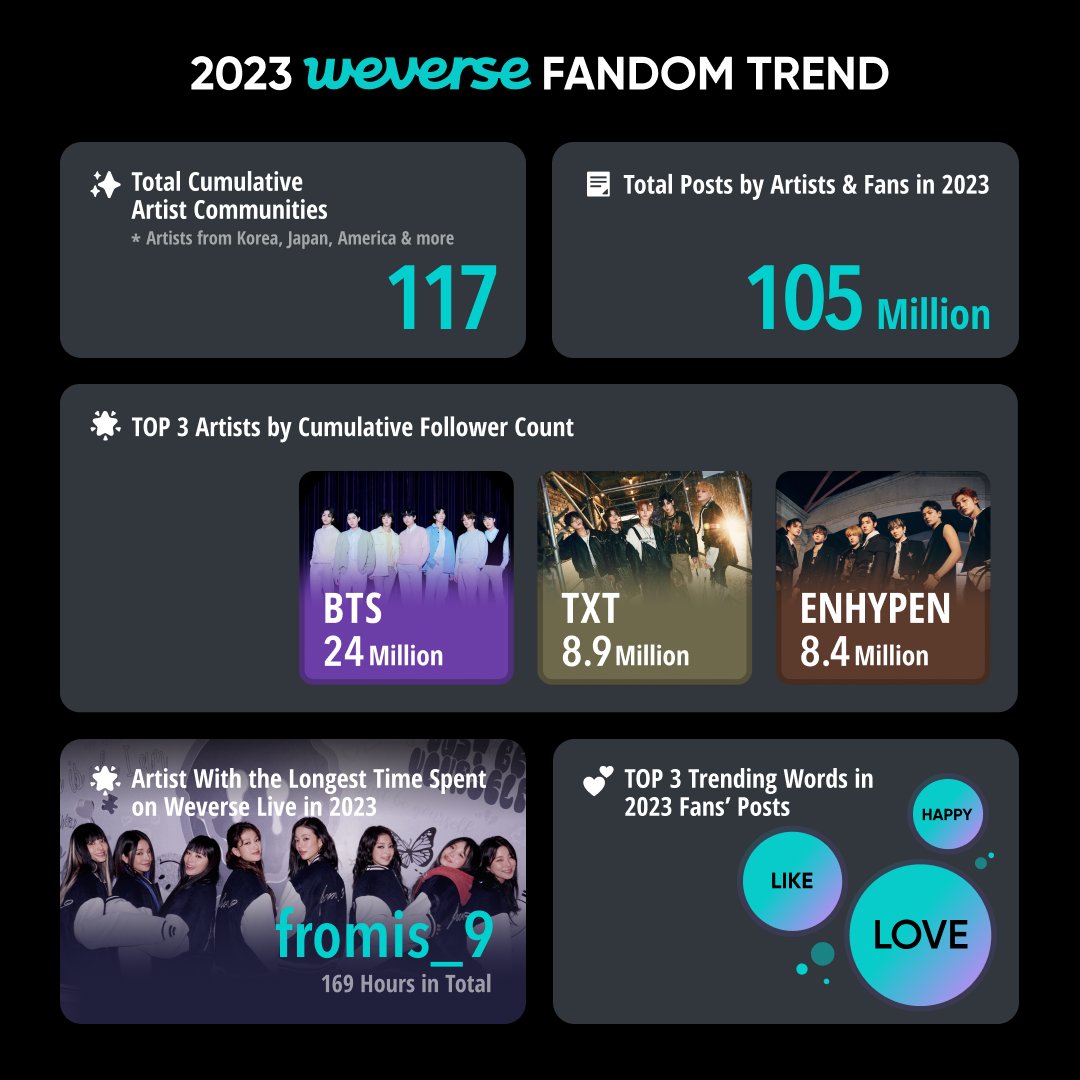 Weverse’s own data shows that there were 105 million total posts on the platform from artists and their fans in 2023