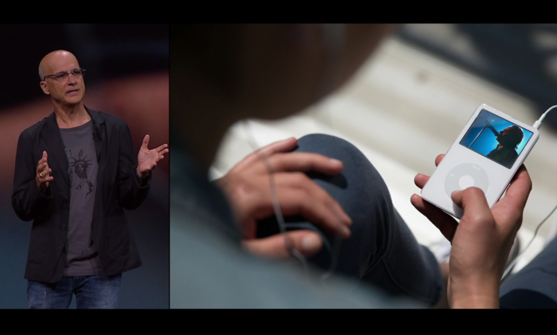Tim Cook told the San Francisco crowd that he wanted to share “a great video about the history of music” and Apple’s place within it.