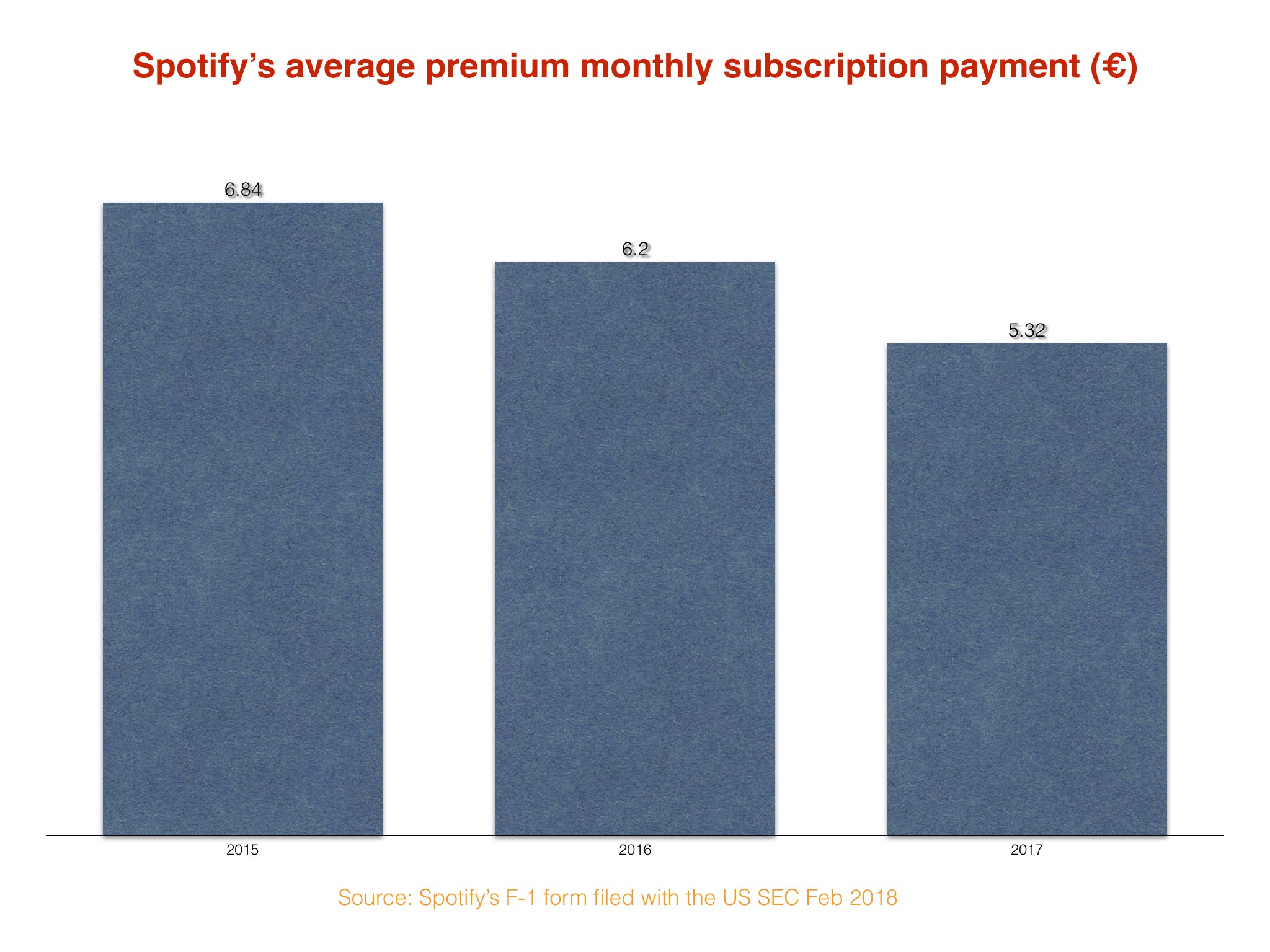 This was made official in Spotify’s F-1 form, where we learned that incentives such as Spotify’s family plan had reduced the average global monthly subscriber spend on Spotify from €6.84 in 2015 to €5.32 in 2017.