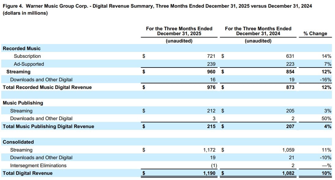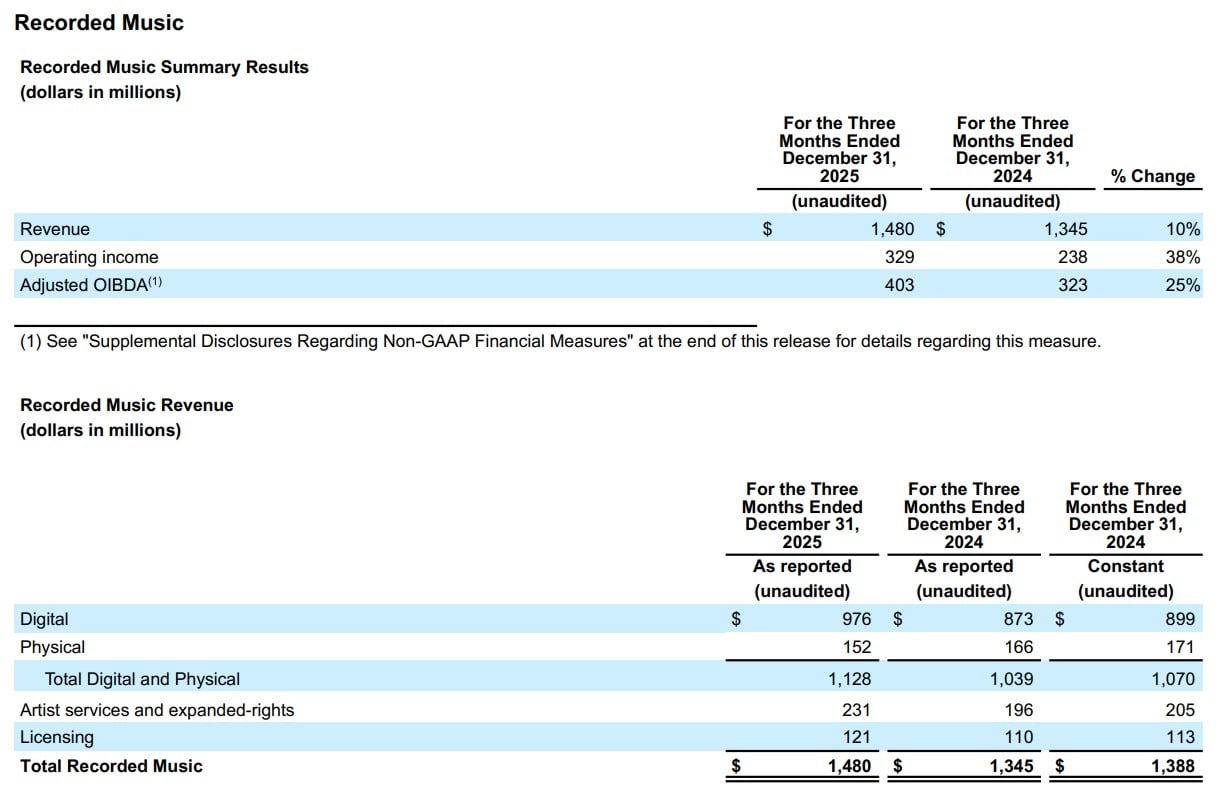 Warner Music Group’s recorded music revenues were up6.6% YoY at constant currency in calendar Q4 to $1.48 billion.