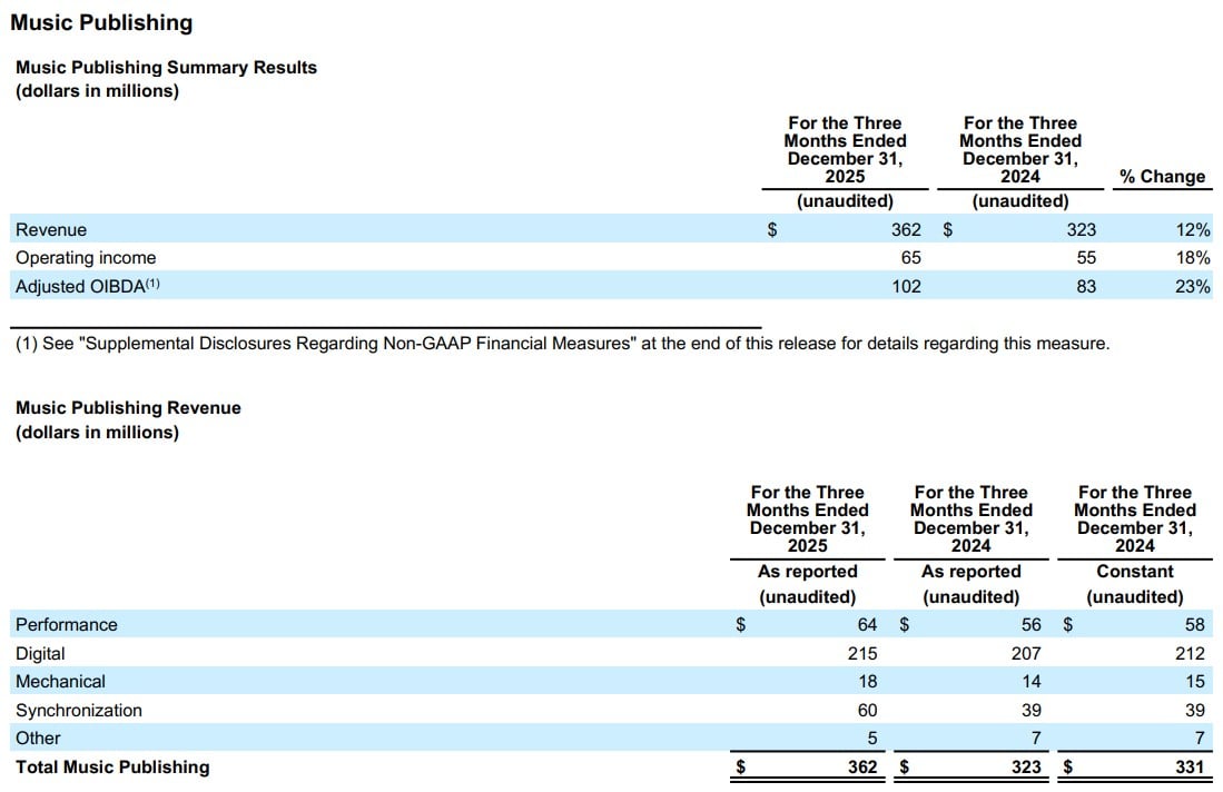 Warner’s global music publishing division – Warner Chappell Music – saw its quarterly revenues increase by 9.4% YoY at constant currency to $362 million.