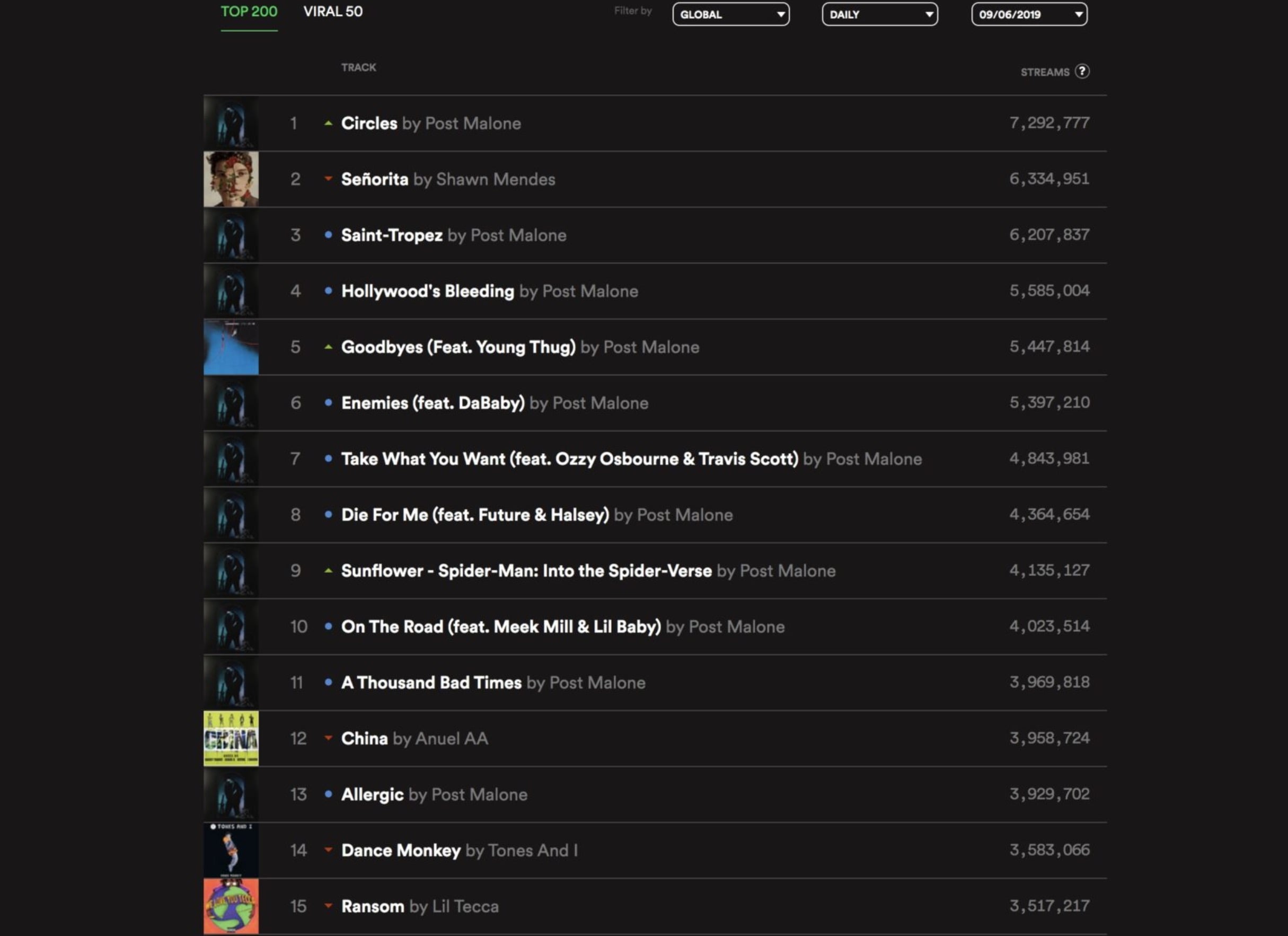 Here’s how the Top 15 of the Spotify global Top 200 chart was transformed on September 6, 2019, when Post Malone – The Weeknd’s fellow Republic-signed superstar – released his latest album, Hollywood’s Bleeding.